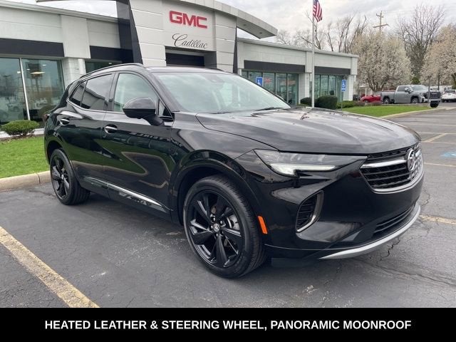 Ebony Twilight Metallic 2022 Buick Envision Essence FWD 9-Speed Automatic 2.0L Turbocharged 2022 Buick Envision Essence Ebony Twilight Metallic, ONE OWNER, NO ACCIDENTS, FACTORY WARRANTY, HEATED LEATHER, HEATED STEERING WHEEL, DUAL PANE VISTA SUNROOF, BLIND SPOT MONITORS, HD SURROUND VIEW, BOSE SOUND SYSTEM, EZ LIFT TAILGATE, REAR CROSS TRAFFIC ALERT, FRONT COLLISION MITIGATION, LANE KEEP ASSIST, POWER LIFTGATE, REMOTE START, ANDROID/APPLE CARPLAY, POWER LOCKS & WINDOWS, TILT & CRUISE, KEYLESS ENTRY & START, POWER SEAT, 3-Channel Programmable Universal Home Remote, 3.47 Final Drive Axle Ratio, 4-Wheel Disc Brakes, 7 Speakers, 7-Speaker Audio System Feature w/Amplifier, 8-Way Power Driver Seat Adjuster, ABS brakes, Air Conditioning, Alloy wheels, AM/FM radio: SiriusXM, Apple CarPlay/Android Auto, Auto High-beam Headlights, Auto-dimming door mirrors, Auto-dimming Rear-View mirror, Automatic temperature control, Black Roof Rails, Body-Color Door Handles, Bose Premium 9-Speaker Audio System Feature, Brake assist, Bumpers: body-color, Carpeted Front & Rear Floor Mats, Compass, Delay-off headlights, Driver door bin, Driver vanity mirror, Dual front impact airbags, Dual front side impact airbags, Electronic Stability Control, Emergency communication system: OnStar and Buick connected services capable, Four wheel independent suspension, Front & Rear Park Assist, Front anti-roll bar, Front Bin Center Console USB Ports, Front Bucket Seats, Front Center Armrest, Front dual zone A/C, Front Passenger 8-Way Power Seat Adjuster, Front reading lights, Fully automatic headlights, HD Radio, HD Surround Vision, Head-Up Display, Heated door mirrors, Heated Driver & Front Passenger Seats, Heated front seats, Heated Steering Wheel, Heated steering wheel, Illuminated entry, Knee airbag, Lane Change Alert w/Side Blind Zone Alert, Low tire pressure warning, Lower Trim/Wheel Arch Moldings, Memory Card Receptacle Audio System Feature, Memory seat, Not Equipped w/Driver & Fr Passenger Heated Seats, Not Equipped w/Front & Rear Park Assist, Occupant sensing airbag, Outside temperature display, Overhead airbag, Overhead console, Panic alarm, Passenger door bin, Passenger vanity mirror, Perforated Leather-Appointed Seat Trim, Power door mirrors, Power driver seat, Power Liftgate, Power Panoramic Tilt-Sliding Moonroof, Power passenger seat, Power steering, Power windows, Preferred Equipment Group 1SL, Premium audio system: Buick Infotainment System, Radio data system, Radio: Buick Infotainment System AM/FM Stereo, Radio: Buick Infotainment System AM/FM w/Nav, Rear anti-roll bar, Rear Cargo Compartment Cover, Rear Cross Traffic Alert, Rear reading lights, Rear seat center armrest, Rear window defroster, Rear window wiper, Remote keyless entry, Roof rack: rails only, Safety Package, Security system, SiriusXM Radio, Speed control, Split folding rear seat, Spoiler, Sport Alloy Pedals, Sport Touring Package, Steering wheel mounted audio controls, Technology Package I, Telescoping steering wheel, Tilt steering wheel, Traction control, Trip computer, USB Charging-Only Ports, Variably intermittent wipers, Wheel Locks, Wheels: 18 Machined Aluminum w/Light Silver Met, Wheels: 20 Aluminum w/Dark Finish, Wireless Apple CarPlay/Wireless Android Auto.