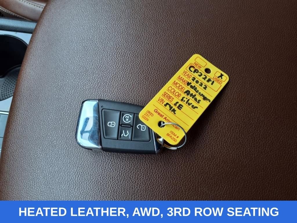 Silver 2022 Volkswagen Atlas 3.6L V6 SE w/Technology AWD 8-Speed Automatic with Tiptronic 3.6L VR6 NO ACCIDENTS, HEATED LEATHER, AWD, 3RD ROW SEATING, POWER LIFTGATE, REMOTE START, ANDROID/APPLE CARPLAY, POWER LOCKS & WINDOWS, TILT & CRUISE, KEYLESS ENTRY & START, POWER SEAT, 3.60 Axle Ratio, 3rd row seats: split-bench, 4-Wheel Disc Brakes, 6 Speakers, ABS brakes, Air Conditioning, Alloy wheels, AM/FM radio: SiriusXM with 360L, Auto-dimming Rear-View mirror, Automatic temperature control, Brake assist, Bumpers: body-color, Compass, Delay-off headlights, Driver door bin, Driver vanity mirror, Dual front impact airbags, Dual front side impact airbags, Electronic Stability Control, Emergency communication system, Exterior Parking Camera Rear, Four wheel independent suspension, Front anti-roll bar, Front Bucket Seats, Front Center Armrest, Front dual zone A/C, Front fog lights, Front reading lights, Fully automatic headlights, Heated Comfort Front Bucket Seats, Heated door mirrors, Heated front seats, Illuminated entry, Leather Shift Knob, Low tire pressure warning, Occupant sensing airbag, Outside temperature display, Overhead airbag, Overhead console, Panic alarm, Passenger door bin, Passenger vanity mirror, Perforated V-Tex Leatherette Seating Surfaces, Power door mirrors, Power driver seat, Power Liftgate, Power steering, Power windows, Radio data system, Radio: MIB3 Composition Media w/8 Touchscreen, Rain sensing wipers, Rear air conditioning, Rear anti-roll bar, Rear reading lights, Rear seat center armrest, Rear window defroster, Rear window wiper, Remote keyless entry, Roof rack: rails only, Security system, Speed control, Speed-sensing steering, Split folding rear seat, Spoiler, Standard Suspension, Steering wheel mounted audio controls, Tachometer, Telescoping steering wheel, Tilt steering wheel, Traction control, Trip computer, Turn signal indicator mirrors, Variably intermittent wipers, Wheels: 20 x 8J 5-Spoke Silver Painted Alloy.